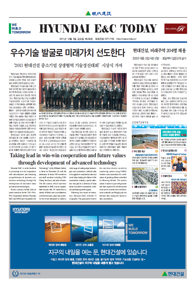 현대건설 사보에 2011 현대건설 중소기업 상생협력 기술경진대회 관련기사가 소개되었습니다.